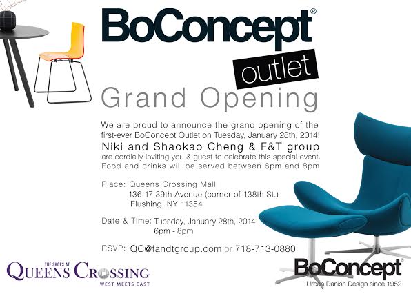 Niki & Shaokao Cheng and the F&T Group cordially invite you to the Grand Opening of the first ever BoConcept Outlet store in Queens Crossing Mall