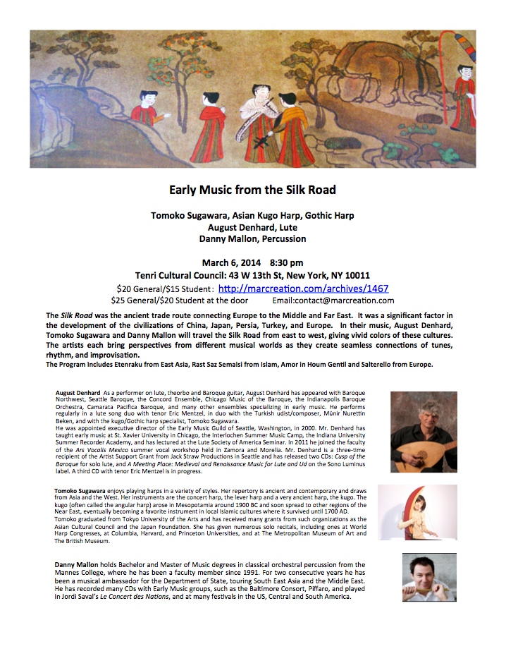 The Silk Road was the ancient trade route connecting Europe to the Middle and Far East. It was a significant factor in the development of the civilizations of China, Japan, Persia, turkey, and Europe. In their music, August Denhard, Tomoko Sugawara and Danny Mallon will travel the Silk Road from east to west, giving vivid colors of these cultures. The artists each bring perspectives from different musical worlds as they create seamless connections of tunes, rhythm, improvisation.