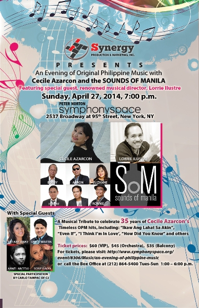 While the Filipino food pancit, lumpia, and balut are slowly breaking into mainstream America, Original Philippine Music (OPM) should not be too far behind—food and music go well together anyway, which was the inspiration for Synergy Productions and Marketing Inc. to stage the concert “An Evening of Original Philippine Music with Cecile Azarcon and Sounds of Manila” at Peter Norton Symphony Space (2537 Broadway and 95th Street) on Sunday, April 27, at 7 p.m.