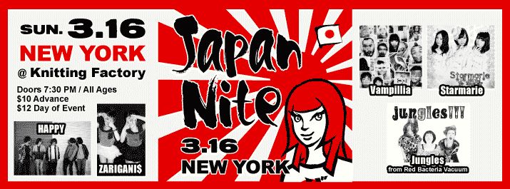 It’s nice they join Japan Nite US tour and come to New York. ( Sorry about they only perform at Knitting Factory Brooklyn and go back to Japan.) You know Kassan, bass of Red Bacteria Vacuum just had a baby boy and while RBV stopped playing, the three member of RBV has started new band, Jungles!!! They them out how wild they are. Then we have Vampillia, They are rock gothic opera and avant-garde orchestra.. and just amazing. Have you seen Zarigani $ when toured USA with UK band, Wedding Presents last year? So happy they joined Japan Nite tour. It’s getting a tradition of Japan Nite to have a rookie of the year. We had OKAMOTO’S in 2010 and NOKIES in 2012 and I would love to introduce this 19-year-old HAPPY, You will see how they speak universal language of Music.