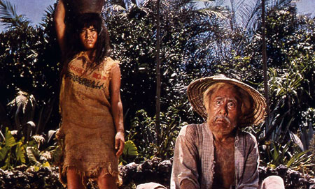 “In The Profound Desire of the Gods, filmed entirely on location on the southern island of Ishigakijima, much of the footage of its original three-hour length is devoted to the topography of the place, its flora and fauna, including the islanders whose ways are as primitive as they are natural. But two-thirds through, the story suddenly breaks off and a title tells us that several years have passed. The spot has been discovered by the tourist industry–planes, taxis, French fries. The final sequence–the shaman menaced by the new train–is affecting because we have come to understand the primitive and to long for it. Now all is gone. The cry of the Coca-Cola seller is the voice of doom. It is the early Japanese, the ‘primitive’ ones, who are real–not our rationalizing contemporaries.” (Excerpted from Richie’s A Hundred Years of Japanese Film.)