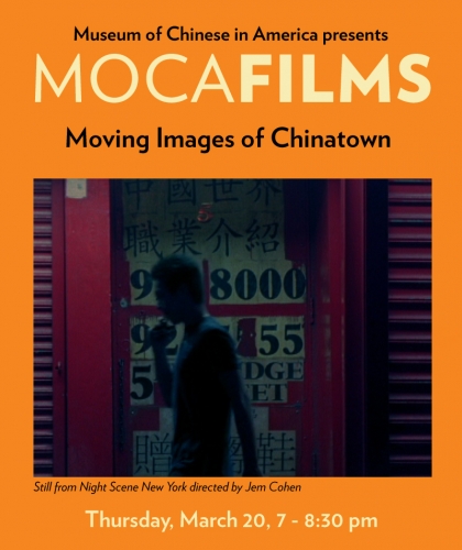 How do filmmakers imagine the people, places and history of Chinatown? This screening includes five original short films by local filmmakers Shelly Silver, Wayne Wang, Richard Wong, Rose Troche, Cary Fukunaga and Jem Cohen all of whom took to the streets of Chinatown, and filmed its residents, streets and stories for the Chinatown Film Project in 2009. MOCA presents their unique vision in conjunction with the Museum’s latest exhibitions, Portraits of New York Chinatown, and A Floating Population.