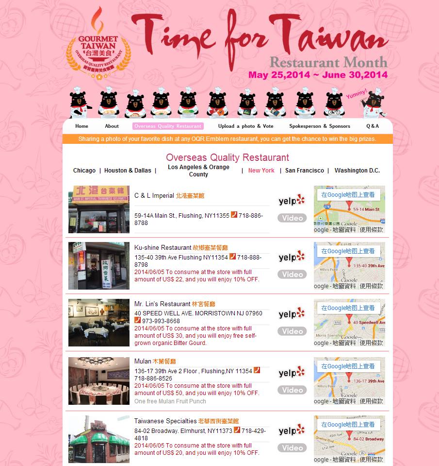 The 2014 Time for Taiwan-Restaurant Month will be officially launched on May 25. 35 Overseas Quality Restaurants (OQR) located in six main U.S. regions of Chicago, New York, Washington D.C., Houston, Los Angeles and San Francisco will be serving up tasty dishes. Fans of Taiwanese cuisine are invited to visit any of the restaurants with the OQR Emblem and enjoy the culinary feasts on offer!