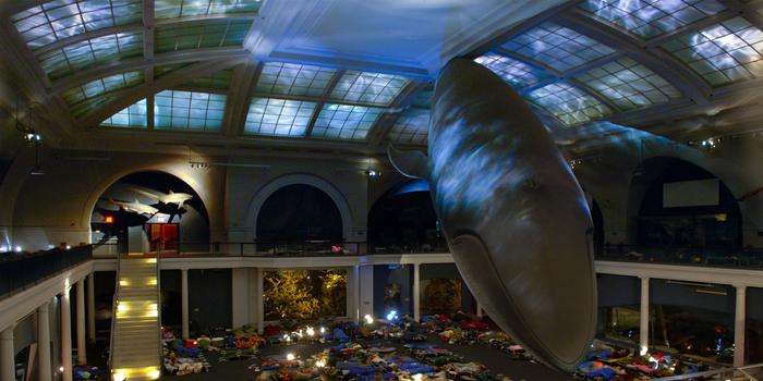 As the evening winds down, guests will be able to unroll their sleeping bags and curl up under the beloved 94-foot-long blue whale in the Milstein Hall of Ocean Life.