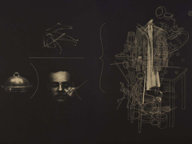 Memory Prints is a solo exhibition by Phillip Chen, a visual artist from the Midwest. In fifteen relief etchings about his family, Chen reckons with significant moments in Chinese American history. At first glance, individually and as an ensemble, these relief prints are schematic and enigmatic. Rooted in personal experiences, the prints depict precisely drawn tools and everyday objects that reflect his family’s occupational histories. The etchings can be approached as part futurist blueprints and part archeological shards, each juxtaposed in an almost Rube Goldberg set of relationships and movements. Their rich darkness reveal precisely drawn tools and everyday objects, an occasional human visage. Each array on each print is imaginatively filled in with lines that interlink and interrelate the items.