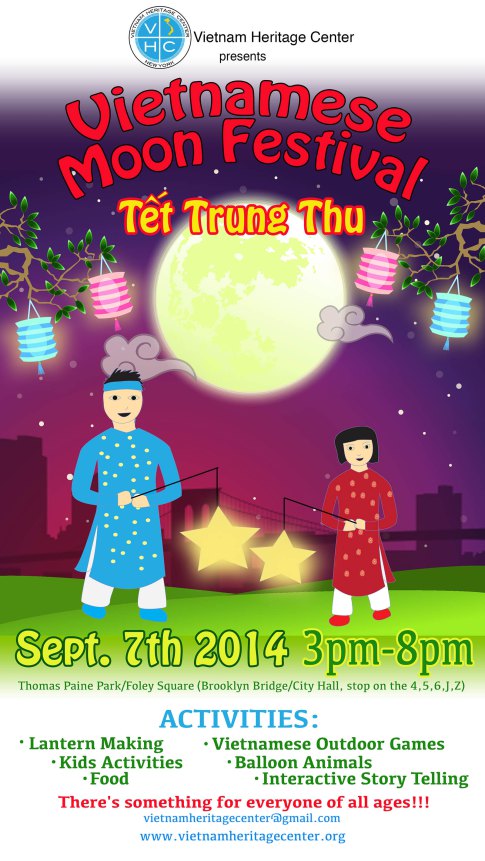 VHC is organizing Tet Trung Thu/Vietnam Moon Festival, which takes place on Sunday, September 7, 2014 at Foley Square Park. This is the first time that the Vietnamese community in New York City has an official celebration of our traditional Mid Autumn Festival. The Moon Festival happens on the 15th of August in lunar calendar, during a full moon. Originally, the festival was meant for everybody to celebrate a harvest season along with moon gazing and moon worship. Gradually, it has changed to be more of a festival for children.