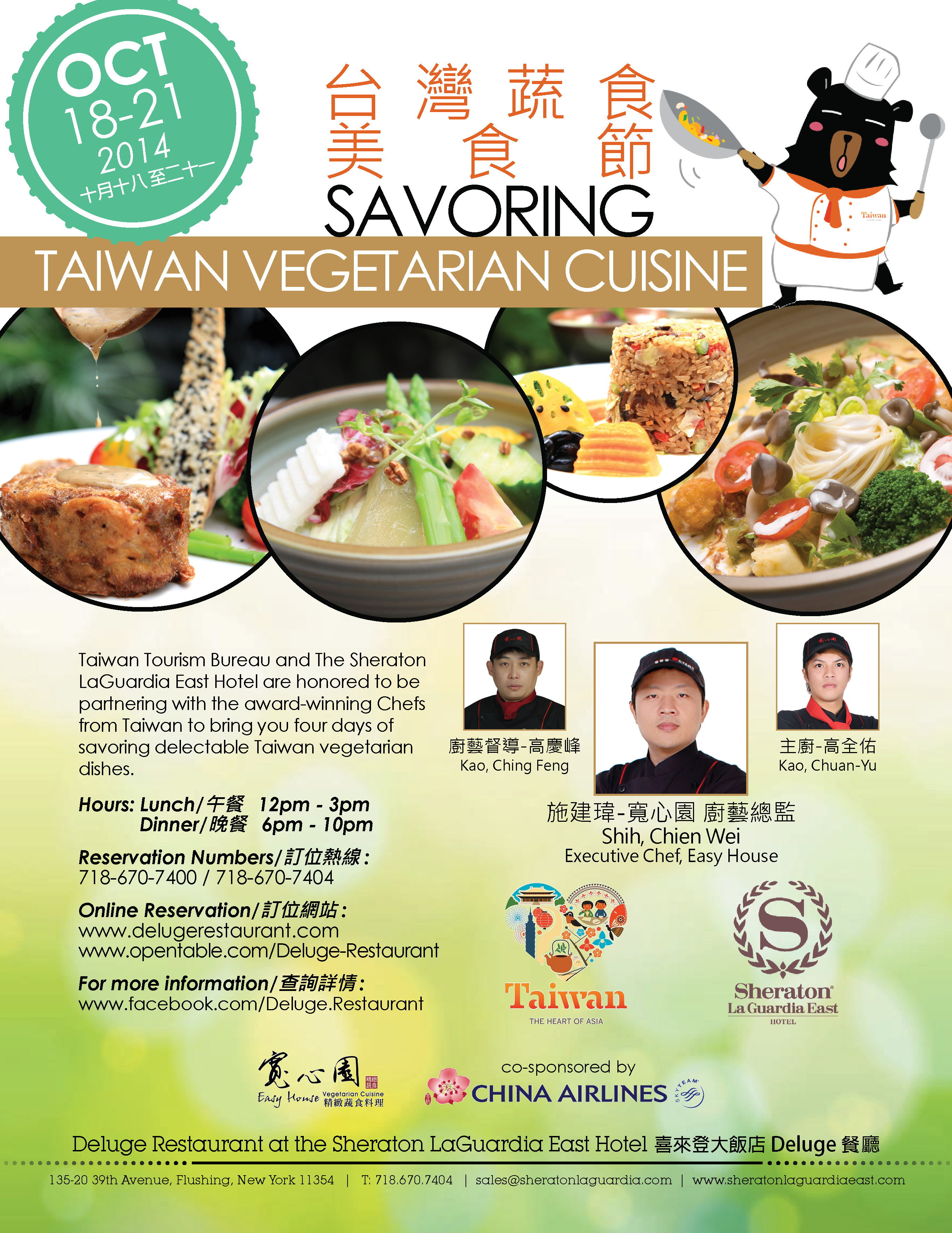 Come Oct 18 – 21, 2014, Sheraton LaGuardia East Hotel and Taiwan Tourism Bureau will partner with award-winning Taiwanese chefs from renowned Easy House Restaurant to present four mouth-watering full days of Asian and fusion vegetarian dish tasting at Deluge Restaurant.