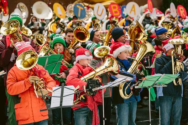 Hundreds of tenor and bass tuba players will congregate on The Rink at Rockefeller Center, 49th and 50th streets between Fifth and Sixth Avenues, on Sunday, December 14, 2014 at 3:30 p.m. to play Christmas carols and other crowd favorites. Tubists of all ages will line up under the famous Christmas tree and fill the plaza with the organ-line sound of low brass. Spectators are encouraged to sing along with the Christmas carols and holiday favorites.