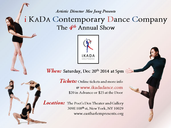 I KADA International Contemporary Dance Company was formed in the summer of 2011 under the artistic director and choreographer Mee Jung. The company name “KADA” stands for Korean American Dance Association. I KADA is a contemporary dance company focusing on cultural exchange through the arts.