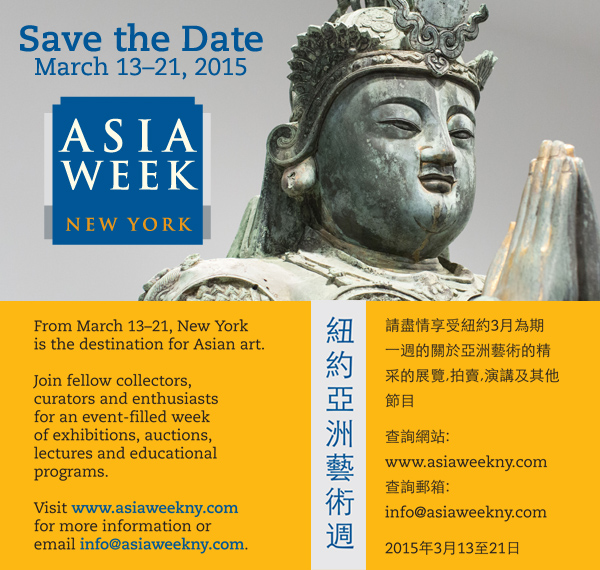 The seventh edition of Asia Week New York will take place from March 13 through 21, 2015, with a whirlwind of exhibitions, auctions and special events to take place throughout midtown and the Upper East Side!
