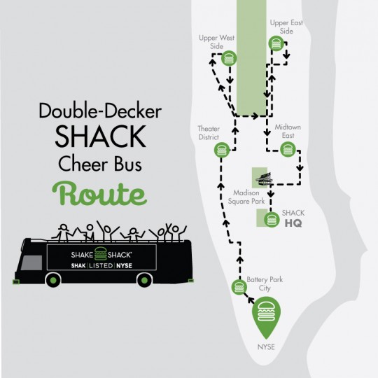 Additional routes: Double-decker Shack cheer bus makes its way from Shack to Shack throughout Manhattan.