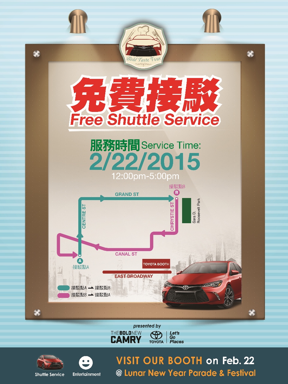 Free Shuttle: Toyota Camry will provide FREE shuttle cars to pick up passengers from Canal Street Subway Station (J/N/Q/R/Z/6) to Grand Street Subway Station (B/D) closer to Sara D Roosevelt Park.