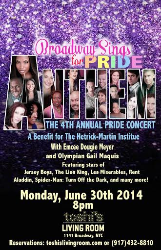 BROADWAY SINGS FOR PRIDE will celebrate NYC Gay Pride by holding with their fourth annual Gay Pride benefit concert with over 15 Broadway shows represented and countless artists! The special one-night benefit entitled “ANTHEM” will feature songs that embody gay perseverance marked by an array of musical performers from the world of Broadway, pop and beyond! Audiences will join the celebration by hearing some of their favorite New York performers take on pop hits, mashups, and Broadway classics. The charity event will be held at Toshi’s Living Room & Penthouse, the best live music bar NYC and best rooftop bar NYC, at West 26th Street, between Broadway & 6th Ave on Monday, June 30, 2014 at 8pm.