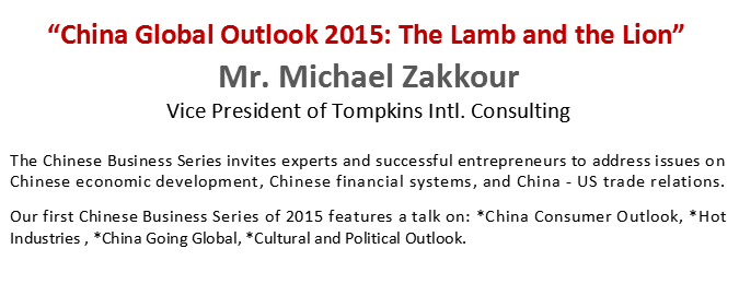 CIB’s first Chinese Business Series Seminar of 2015 with Mr. Michael Zakkour, the Vice President of Tompkins Intl. Consulting on Wednesday, February 25th from 6:00 – 8:00 PM. The topic for this seminar is “China Global Outlook 2015: The Lamb and the Lion.” Mr. Zakkour will address key issues on China Consumer Outlook, Hot Industries, China Going Global, and the Cultural and Political Outlook.