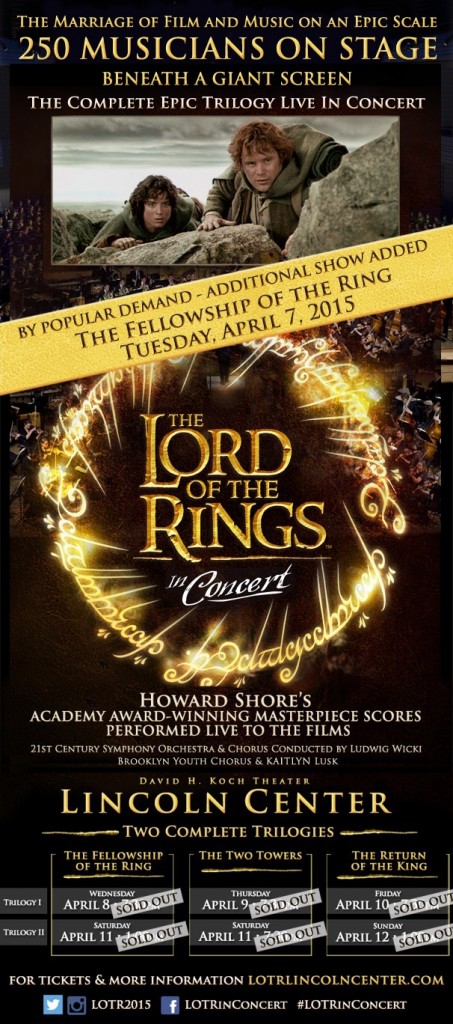 For the first time ever in North America, the complete film trilogy, The Lord of the Rings, will be presented live, in concert, April 8-12, 2015. Beneath a giant screen, the Academy Award-winning scores by Howard Shore will be performed by 250 musicians, on stage, including symphony orchestra, chorus and soloists. Two complete trilogies, Wednesday-Friday, April 8-10, and Saturday-Sunday, April 11-12.