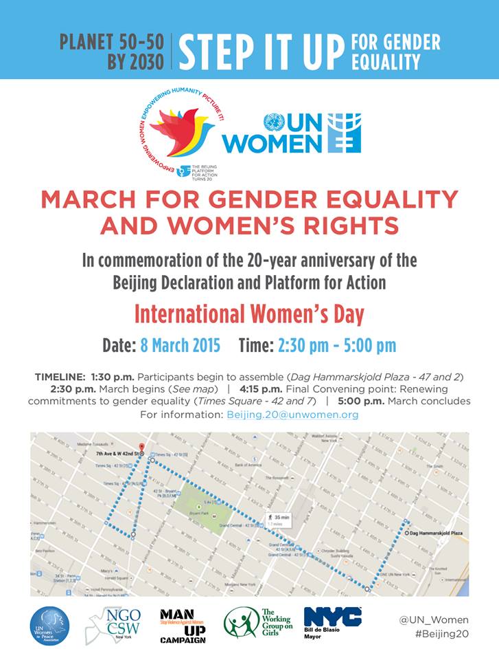 In commemoration of the 20-year anniversary of the Beijing Declaration and Platform for Action, we will march for gender equality on International Women’s Day! Please join us and our partners, the City of New York, the UN Women for Peace Association, NGO CSW New York, Man Up Campaign, and the Working Group on Girls.