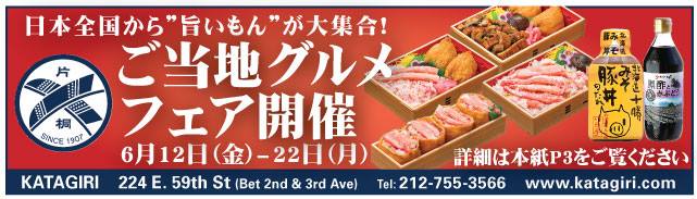 New York’s oldest Japanese grocery store, Katagiri, will host a Japanese Gourmet Fair from June 12 to 22 at their Midtown East location. During this period of time, customers can enjoy a variety of Japanese gourmet items. On the 12th and 13th, a sauce maker, Sorachi, will provide free samples of original pork bowl. Between the 15th and 18th, special crab sushi roll and chirashi by a bento maker from Hokkaido will be on sale. Also, there will be a Kurozu (black vinegar) sample sale by Sakamoto Kurozu, Inc. on the 19th and 20th.