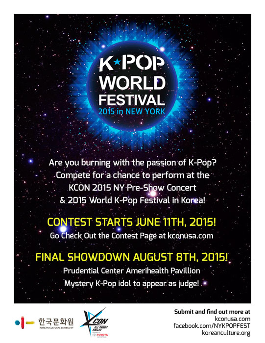 NY K-POP Festival is one of the biggest events where every global K-Pop fan enjoys and shows their K-Pop talents. It has started in 2011 and now we’re holding another 5th successful festival this year. This year, we work together with 2015 KCON NY, the biggest Korean wave (Hallyu) convention. Thus, not only K-Pop contest, but we can also enjoy more various Korean contents such as K-Pop stars’ concerts, Korean foods and beauty convention, and etc. Korean Cultural Service NY presents global k-pop singing and dancing competition “2015 NY K-Pop Festival at KCON” has begun accepting video submissions. Auditions will be held worldwide and six finalists will compete at KCON 2015 NY on August 8 at the Prudential Center AmeriHealth Pavilion for a chance to win an appearance in the K-Pop World Festival in Changwon, South Korea. Entries to the competition can be made at www.kconusa.com