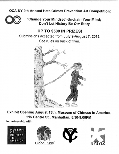 MOCA is proud to host the 9th Annual Hate Crime Prevention Art Exhibit organized by Organization of Chinese Americans – New York Chapter (OCA-NY). Join OCA-NY in supporting this citywide high school students’ exhibition based on the theme of “Change Your Mindset”-Unchain Your Mind; Don’t Let History Be Our Story. The exhibition will run from August 13 – 30, 2015.
