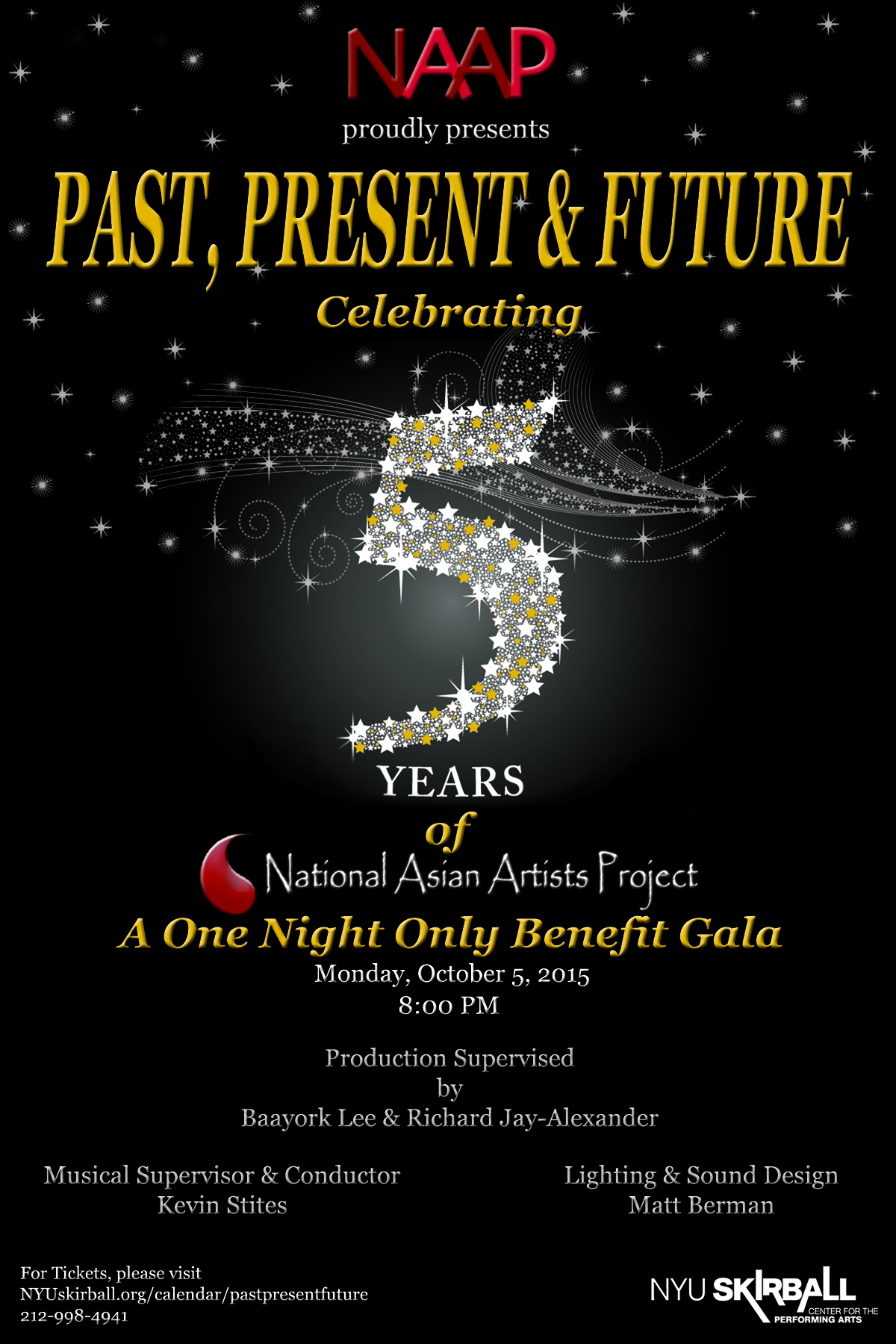 National Asian Artists Project (Baayork Lee, Executive Artistic Director), will celebrate its 5th Anniversary of “showcasing the work of Asian-American theatre artists through performance, outreach and educational programming” on Monday, October 5th at 8pm at NYU Skirball Center for the Performing Arts (56 LaGuardia Place) with Past, Present & Future, a one-night- only Gala Benefit evening featuring a line-up of show-stopping wall-to-wall musical numbers from Broadway shows, highlights from past NAAP productions and current material, as well as what Ms. Lee hopes to stage in the future. With a cast of over one hundred supervised by Ms. Lee and acclaimed director Richard Jay-Alexander, the evening will feature seasoned Broadway professionals – friends and supporters of NAAP – staging many of the numbers. With a full orchestra led by Broadway musical supervisor and conductor Kevin Stites and lighting & sound design by Matt Berman, this is a once-in-a-lifetime opportunity to support this worthy company as they head into the future. To see established Broadway stars and the young members of NAAP “side-by-side” is sure to be a night to remember.