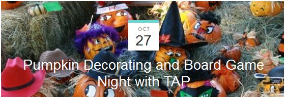 Remember when you were a kid and decorated pumpkins in school to bring home to your parents? Bring back the fun and join TAP for an evening of pumpkin decorating and board games!