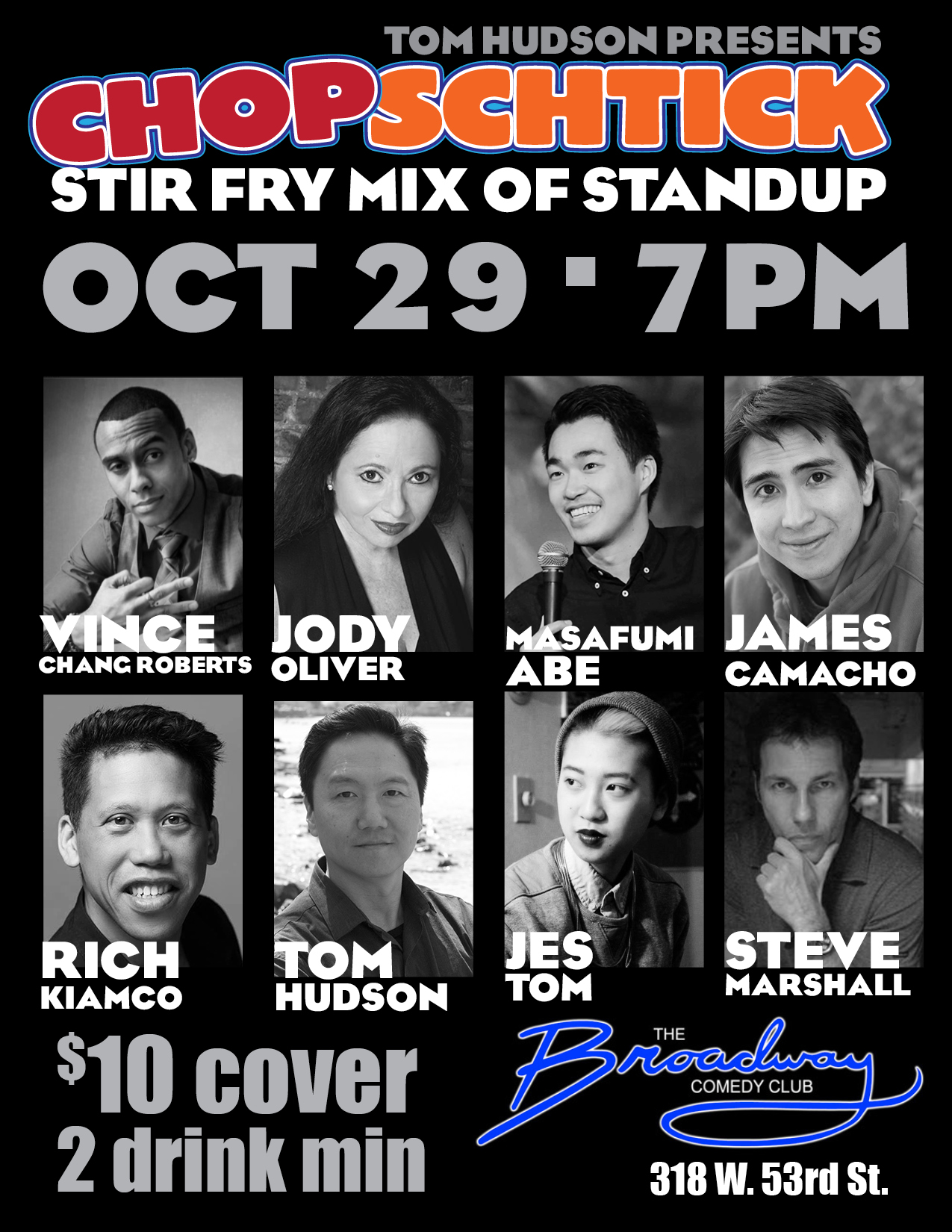 Chopschtick (Asian-American standup) is back at Broadway Comedy Club! Oct 29th, thurs, 7pm. Just $10 cover and 2 drink min. Headliner, and honorary Asian, Steve Marshall joins a hilarious lineup of comedians: Vince Chang Roberts, Jody Oliver, Masafumi Abe, Jes Tom, James Camacho, Rich Kiamco and Tom Hudson. Plus, there’s Hudson’s Halloween Raffle Prizes.