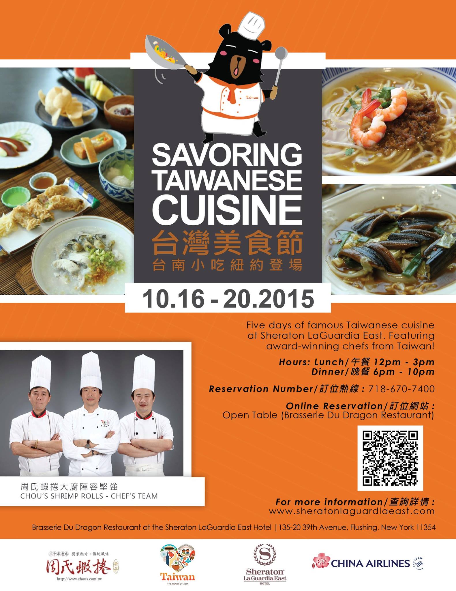 Taiwan Tourism Bureau, China Airlines and Sheraton LaGuardia East Hotel are jointly presenting the second year of Savoring Taiwanese Cuisine Week. Renowned Chou’s Shrimp Rolls Restaurant from Tainan City was selectively invited to offer five mouth-watering full days of iconic Tainan street snacks tasting at Brasserie du Dragon, newly renovated upscale restaurant of a variety of authentic Chinese Cuisine fashioned in new styling and presentation.