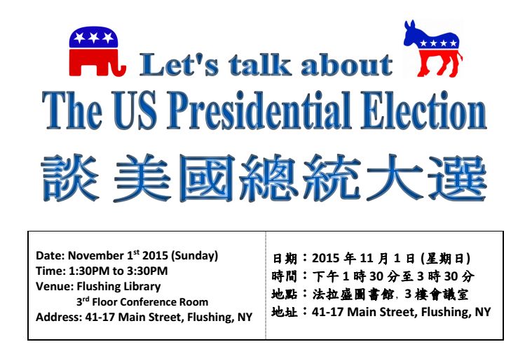Chinese American Voters Association of USA (CAVA) is hosting a Presidential Election Seminar on November 1st at 1:30pm.