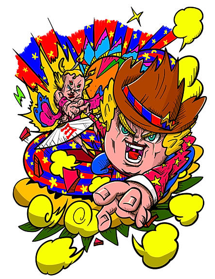 The drawing doesn’t show only his inside but it is a communication tool for him. He mixes the scenes of the Japanese comics with humor, and paints with avant-garde color affected by the town where he lives. Recently, his characters have been increasingly muscular since he started going to the gym. Muscular people seem to be narcissistic, pose and look at the mirror like in front of the camera. Everyone is the main character there.