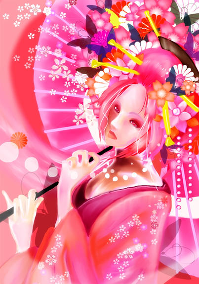 The series TOKYO RAINBOW expresses the beauty of Japanese style with women as a motif, as well as a temporal change of four seasons using the colors seen in a rainbow. Each woman associates the image of foremost courtesans “Oiran” in the Edo period in Japan. The butterflies in the picture mean the temporal change of that a butterfly emerges from a pupa, expressing a fleeting, ephemeral beauty of life and its vitality. The idea that everything always transits and changes also relates to Daisuke Kaneko’s stance to the activity of creation.