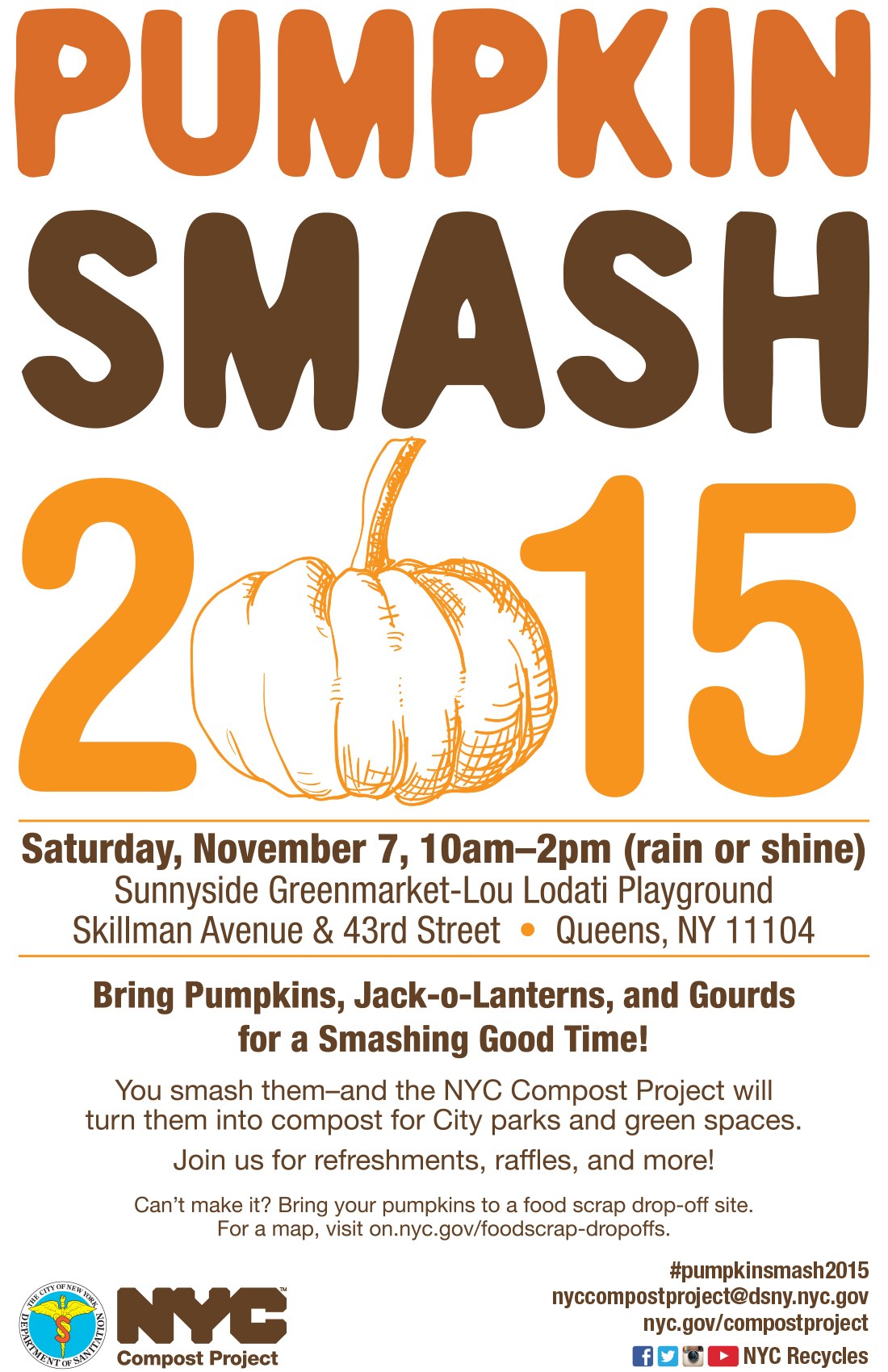 Bring Pumpkins, Jack-o-Lanterns, and Gourds for a Smashing Good Time! You smash them-and NYC Compost Project will turn them into compost for City parks and green spaces. Join us for refreshments, raffles, and more!