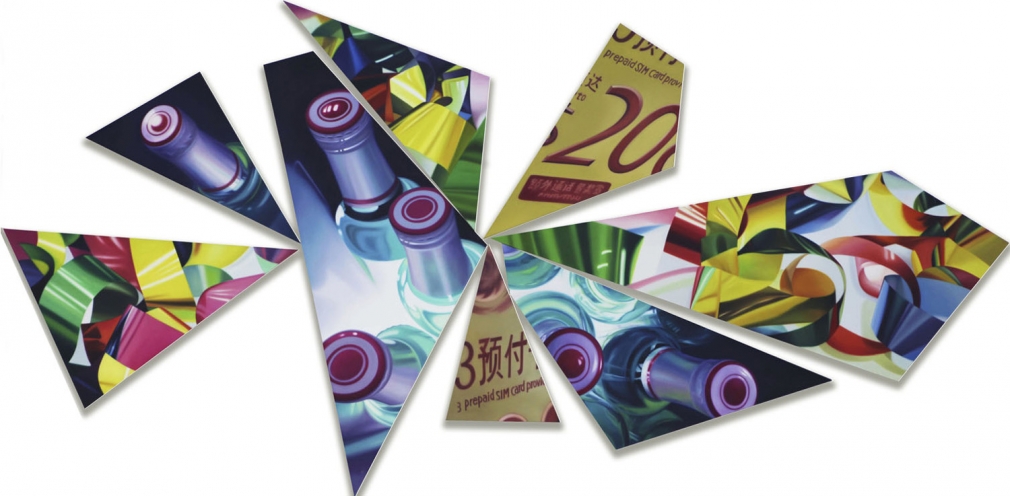 Irregular, fragmented and distorted, the hyper-realistic subjects in Chen Wenbo’s “Broken” paintings convey satirical messages, which have been inspired by the “carnivalesque” – the English translation of the term coined by Russian critic Mikhail Bakhtin to describe a social landscape mired in revelry. Chen paints everyday objects as shiny, glossy beacons of desire. Drawing from the theory of “fat years,” an illusion of accelerated economic growth manipulated by higher powers, Chen is both a critic and participator in this bubble of celebration. The audience too, cannot escape this dichotomy: the installed canvases are sliced and carved into silvers, revealing just enough of an illusion to entice; the exhibition walls are fully painted in vivid color.