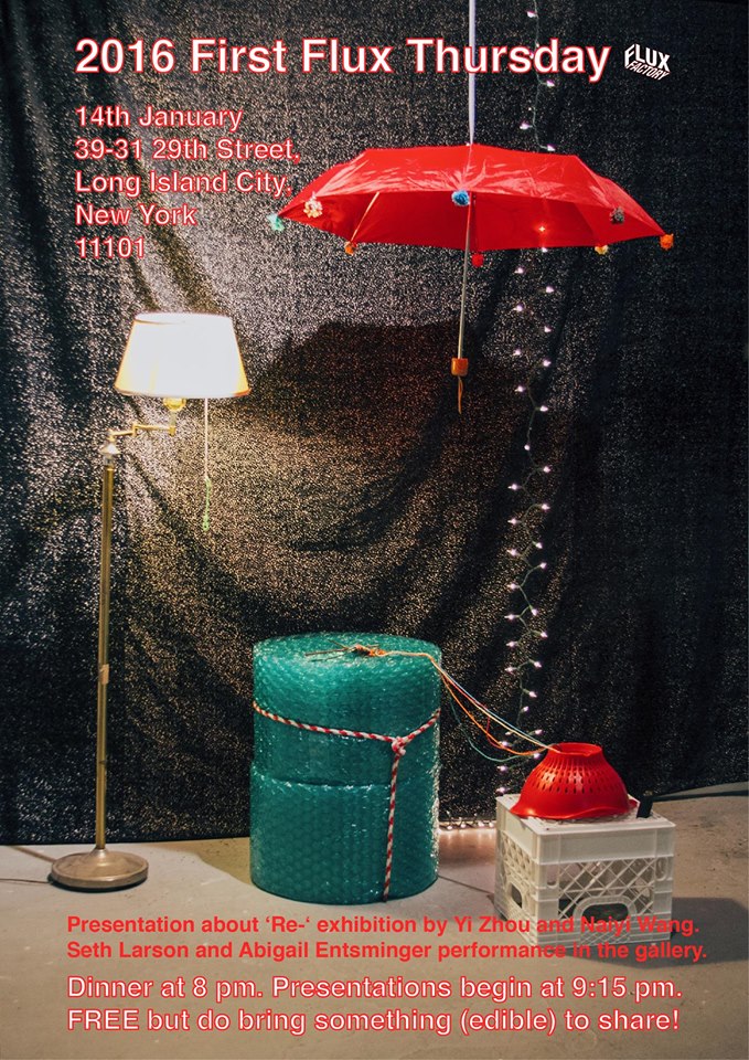 ‘Re-‘ curator Naiyi Wang and participating artist/ Flux resident Yi Zhou will dive into the inspiration behind the show (in Flux’s gallery January 9-14). The exhibition was partly inspired by a conversation with Yi at Flux, a space for artists that is filled with “re” purposed objects. Flux residents Seth Larson and Abby Entsminger will host a special performance in the gallery.