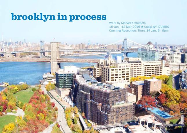 Usagi NY is pleased to announce the exhibition Brooklyn in Process | Work by Marvel Architects. The show explores the creative process and reveals, through multi-media presentation how one firm found inspiration for seven distinct projects. We will showcase Marvel’s recent work in Brooklyn, including St. Ann’s Warehouse in DUMBO, PierHouse in Brooklyn Bridge Park and McCarren Pool in Williamsburg. The show features aerial video by Marvel Vision.