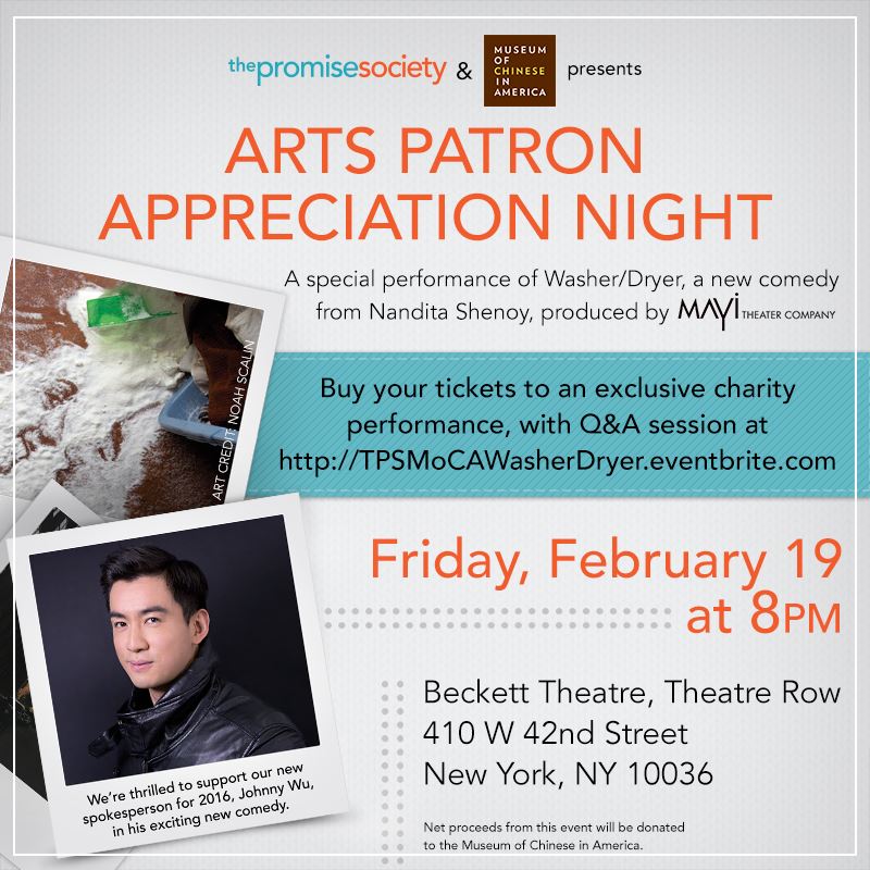 On February 19th, join The Promise Society (TPS) and Museum of Chinese in America (MOCA) for Arts Patron Appreciation Night, featuring a special exclusive showcase of Nandita Shenoy’s new Off-Broadway Play “Washer/Dryer,” directed by Benjamin Kamine and produced by the award winning Ma-Yi theater company. The performance will be followed by a moderated Talkback session with star, Johnny Wu and the cast. Each attendee for this show will also receive a signed show poster by the cast. VIP ticket holders (Lantern Package and Patrons of the Arts Package) will have access to premium seating and an intimate Meet & Greet reception with the cast after the show, as well as an annual MOCA membership. The February 19th showing is a private event open only to TPS and MOCA attendees. Net proceeds from ticket sales will be donated to support MOCA’s programs and services to help to maintain the wide array of exhibitions, educational and public programs, and community initiatives that allow MOCA to fulfill its important mission.