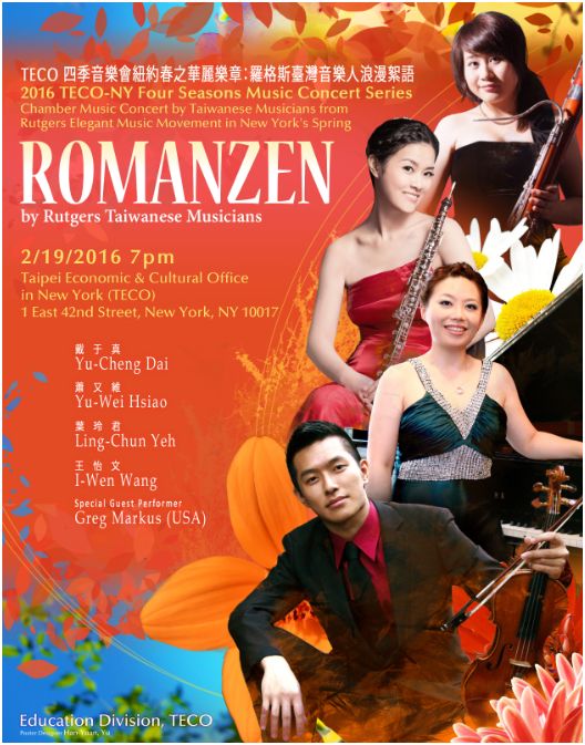 2016 TECO-NY Four Seasons Music Concert Series presents the Chamber Music Concert by Taiwanese Musicians from Rutgers Elegant Music Movement in New York’s Spring ROMANZEN!