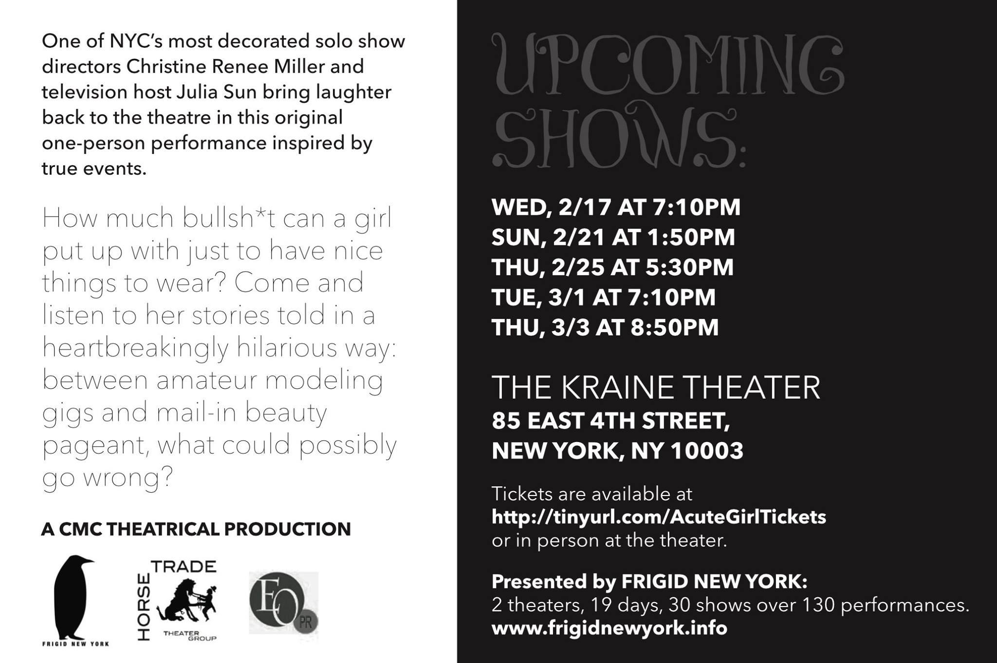 How much bullsh*t can a girl put up with just to have nice things to wear? Come and listen to her stories told in a heartbreakingly hilarious way: between amateur modeling gigs and mail-in beauty pageant, what could possibly go wrong?