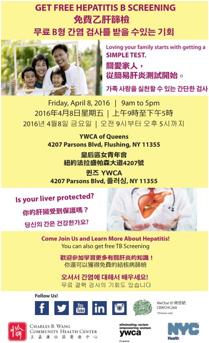 Loving your family starts with getting a simple test. Join us to for a free hepatitis B and TB test, and to learn more about hepatitis. There will be interpetation and translation services available on site for English, Chinese (Mandarin, Cantonese), and Korean. Event will take place Friday, April 8, 9AM – 5PM, located at the YWCA of Queens, 4207 Parsons Blvd, Flushing, NY 11355. Learn more at http://www.cbwchc.org/events