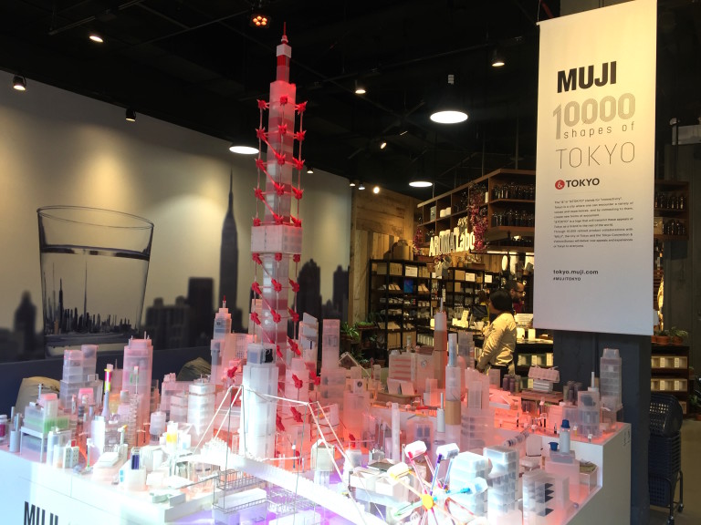 The interesting thing about the diorama is that the city of Tokyo is recreated using everyday products that you can find in the store. The spokes of the Daikanransha Ferris wheel in Odaiba are made of MUJI’s gel pens, plastic storage containers stand in as buildings, and aroma diffusers give the allusion of steam rising throughout a bustling city.