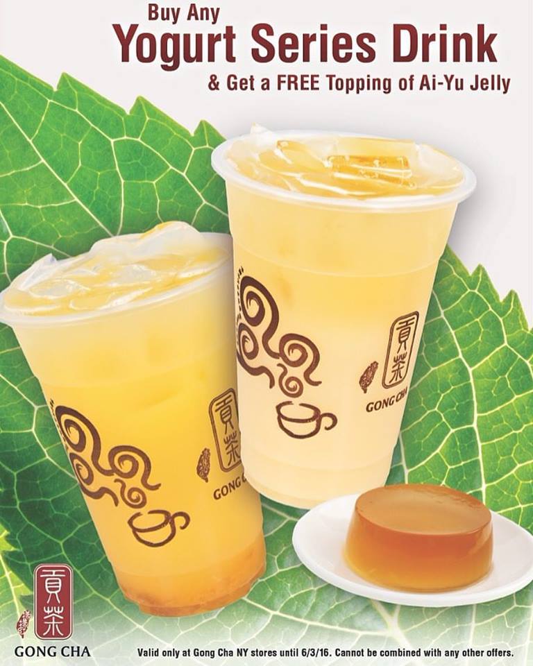 Buy any Yogurt Series drink and receive a free topping of ai-yu jelly now until 6/3/16.