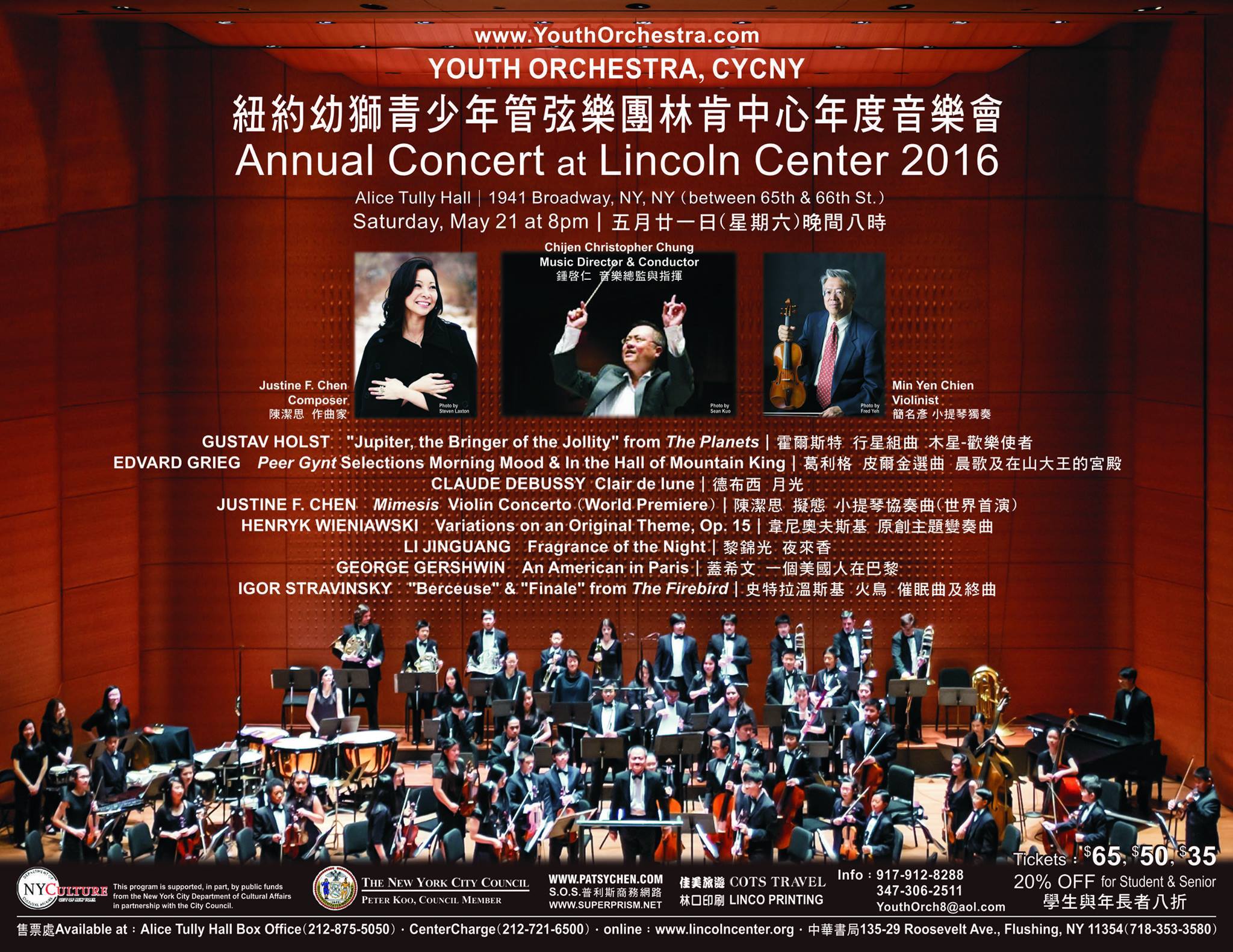 Featuring world-renowned violinist Min Yen Chien in the World Premiere of Mimesis (2016), written expressly for Professor Chien and CYCNY by Taiwanese-American composer and violinist Justine F. Chen