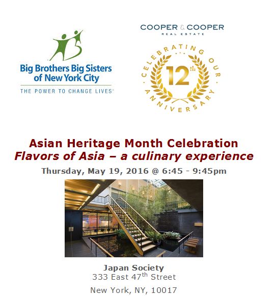 National Association of Asian American Professionals, New York (NAAAP-NY) along with our community partner Big Brothers Big Sisters – Asian Mentoring Committee and our corporate partner Cooper & Cooper is pleased to present a celebration of Asian Heritage Month with Flavors of Asia – A Culinary Experience
