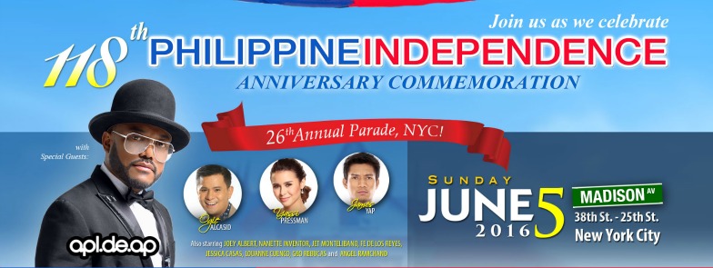 118th Philippine Independence Anniversary & Annual Parade in NYC Featuring Apl.De.Ap – of the Grammy Award-winning group The Black Eyed Peas (rapper, singer, and record producer); TV5 Kapatid artists Ogie Alcasid, Yassi Pressman and PBA’s James Yap PLUS many more artists to entertain the Pinoys. A fun filled day for the family and friends …