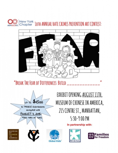 This multicultural project recognizes the relevance of hate crimes today, and empowers ethnically diverse high school interns from local youth groups to use art as a tool to educate and combat hate crimes. The knowledge gained during the Project culminates in a hate crimes prevention art contest, with prizes totaling $1500, for high school students citywide to compete in. This year’s theme is “Break the Fear of Differences: Build __________.” Submissions due by August 7th. We urge high school students to submit artwork to see their “artivism” displayed in in a real museum!