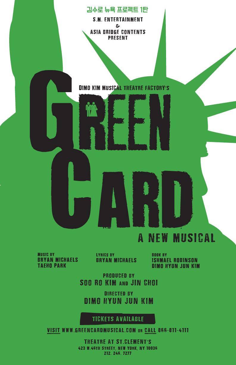 S.M. Entertainment, Asia Bridge Contents and Dimo Kim Musical Theatre Factory present Green Card: A New Musical, directed by Dimo Hyun Jun Kim with musical direction by TekGoo Kang. Written by Dimo Hyun Jun Kim and Ishmael Robinson, with music by Bryan Michaels and TaeHo Park. The new musical which produced by Soo Ro Kim and Jin Choi, will be staged.