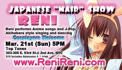 In 2008 Reni relocated to New York City and hopes to bring this unique style to the United States. As interest in Japanese entertainment grows among the American youth, Reni offers her audiences the most fun and authentic Japanese pop experience, without ever having to travel to Tokyo. In 2009, she began her regular monthly Japanese ‘Maid’ Show events, and has been invited as a guest performer to Japan Society, Otakon and NY Anime Fetival this year. Reni is quickly winning over the hearts of many new local fans, thanks to her pretty stage costumes, upbeat personality, and her outstanding singing talent. Her new CD album “Sakura” is released on September 25th, 2009
