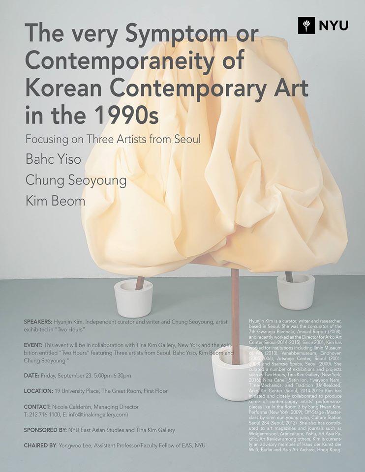 This talk is focusing on three Korean artists, Beom Kim, Seoyoung Chung and Yiso Bahc and their works produced from the late 1990s to the early 2000s. Three artists and their experiences with Korean society and culture witnessed the pivotal shift in Korean contemporary art during the turn of the century. Each has developed a strong allegorical language that lucidly records the profound changes that occurred during this period in Seoul. This event is collaborated with Tina Kim Gallery in New York and the exhibition entitled “Two Hours: Three Artists from Seoul, Bahc Yiso, Kim Beom and Chung Seoyoung “