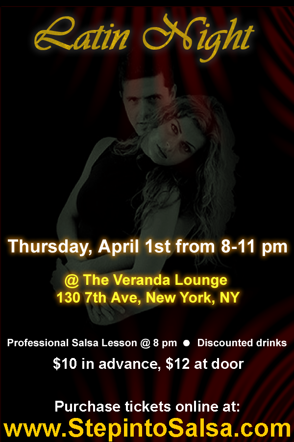 Don’t miss the hottest Latin Night in NYC. Join us as we dance the night away to Salsa and other sultry Latin rhythms while immersed in the intimate, candle-lit atmosphere of the Mediterranean-style Veranda Lounge. Professional Salsa lessons taught by Step Into Salsa at 8 pm followed by Latin dancing and mingling in a cozy, alluring ambience.