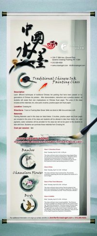 Learn different techniques of traditional Chinese ink painting that has been passed on be generations of Chinese ink painters. After demonstration, instruction and a practice session, all students will create their own masterpieces on Chinese Xuan paper. The price of the class includes all of the materials; ink, color paint, brushes, practice paper and Xuan paper.