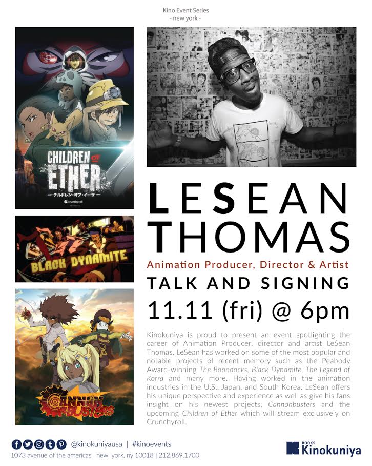 Kinokuniya is proud to present an event spotlighting the career of Animation Producer, director and artist LeSean Thomas. LeSean has worked on some of the most popular and notable projects of recent memory such as the Peabody Award-winning The Boondocks, Black Dynamite, The Legend of Korra and many more. Having worked in the animation industries in the U.S., Japan, and South Korea, LeSean offers his unique perspective and experience as well as give his fans insight on his newest projects, Cannonbusters and the upcoming Children of Ether which will stream exclusively on Crunchyroll.